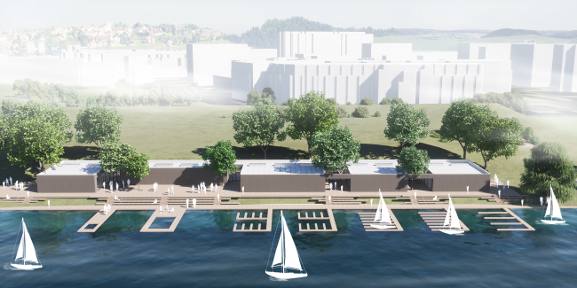 В этом проекте центр водных видов спорта состоит из пяти блоков, расположенных вдоль береговой линии и создающих полуприватные, раскрывающиеся на набережную дворы-террасы. Одной из главных задач архитекторы видели максимально точно вписать новый объект в рельеф местности.
