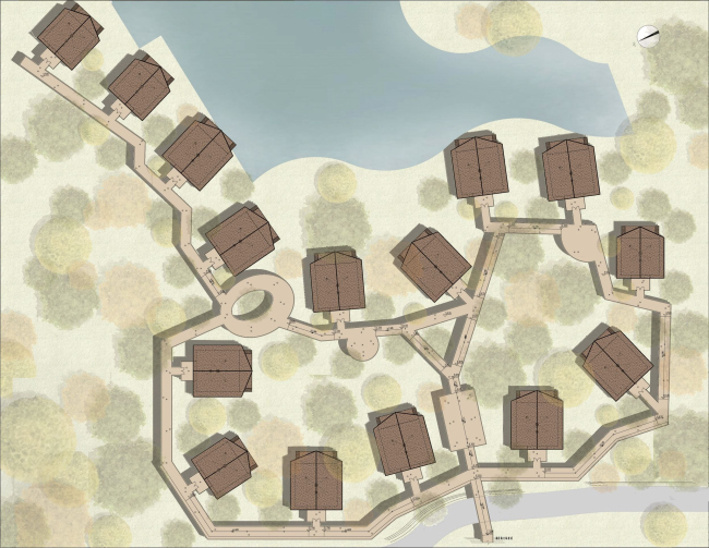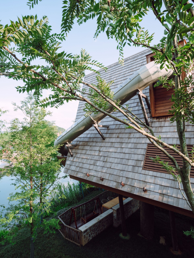 На уровне земли устроены террасы и качели; их можно встретить и на мостиках-переходах, которые связывают домики между собой.