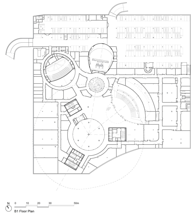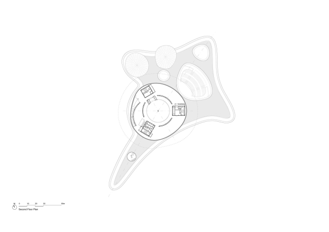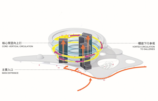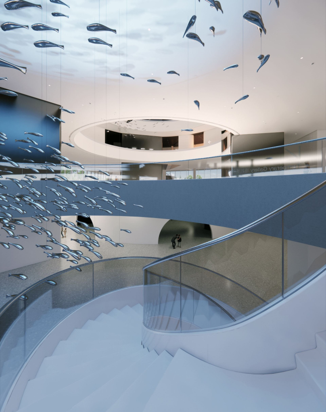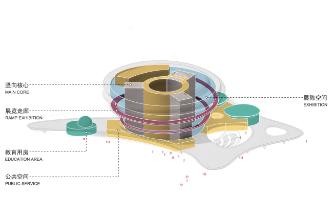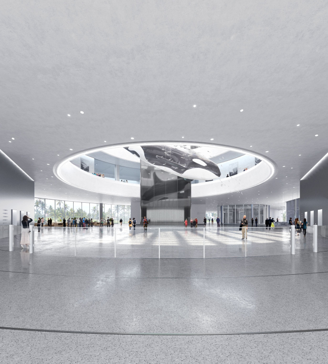 По замыслу Ма Яньсуна и его бюро MAD, посетители будут подниматься на лифте на верхний, пятый уровень: там они полюбуются видами города сквозь панорамные окна и осмотрят постоянную выставку о технологиях и космосе. Затем они начнут спуск по пандусу, вдоль которого задумана отдельная экспозиция – помимо выставочных залов. Речь пойдет об океане и естественных науках на четвертом и о точных науках на третьем этажах. На втором устроят мультимедийную интерактивную зону и детскую игровую площадку.