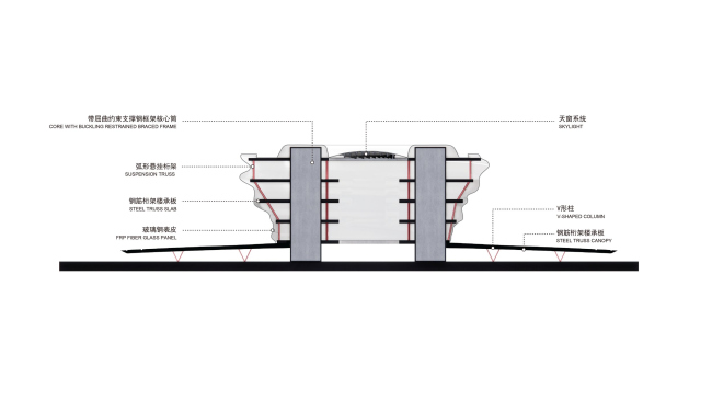 Перекрытия остекленного первого этажа расширяются вокруг музея в форме навеса, защищая посетителей от капризов влажного хайнаньского климата. Под этой кровлей помещены кинозалы – с огромным экраном и с симулятором полета, обсерватория и планетарий. Рядом расположены заглубленная площадь и зеркальный пруд.