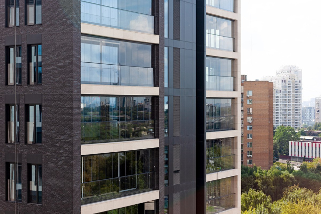 Элегантность, неподвластная времени, достигается во многом за счет решения фасадов как «чистых этюдов» из стекла, натурального камня и клинкерного кирпича. Окна в пол и сплошное остекление стен стали естественным решением, так как из комплекса открываются роскошные виды на Воробьевы горы, высотку МГУ, Парк Победы и другие достопримечательности столицы. Особенно вдохновляющие пейзажи можно наблюдать из пентхаусов и с террас, которые устроены в верхней части каждого корпуса. Остальные стены облицованы либо светлым камнем и черными панелями, либо кирпичом Hagemeister сдержанных тонов, близких к монохромным. Поставщик клинкера – компания АО «Фирма «КИРИЛЛ», более двадцати пяти лет работающая на российском рынке.