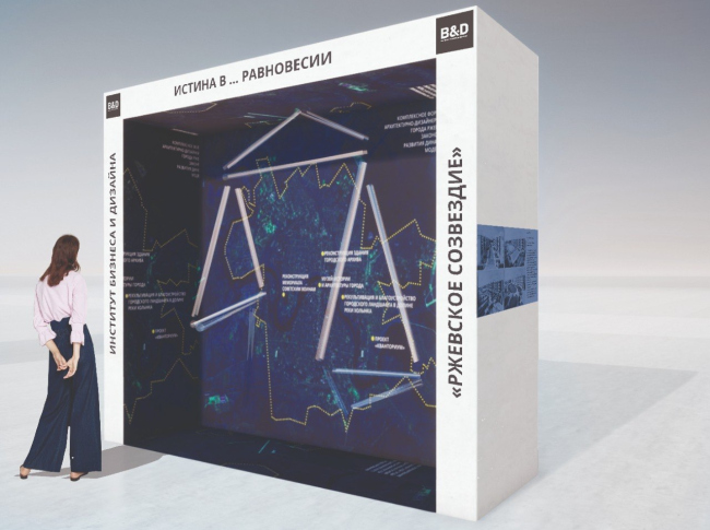Экспозиция представляет собой полупрозрачную скульптуру – мобиль, балансирующий в среде перспективного генплана города, который графически решен как космическое пространство созвездия Весов.