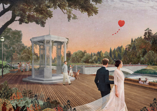 На прилегающем участке набережной предлагается создать тихое природное место с ротондой для фотосессий, которая может стать «программной» точкой для молодоженов. Пешеходный мостик через реку одновременно выполняет функцию смотровой площадки с видом на водный каскад, а вдоль противоположного берега устанавливается пешеходный деревянный настил с лежаками и скамейками для тихого отдыха.