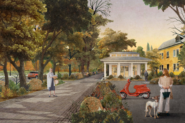 Проектом предусмотрено комплексное благоустройство и озеленение территории, формирование многофункциональных общественных пространств. Существующую парковку на Демьяновском проезде, предназначенную для гостей музея-заповедника Петра Чайковского и исторической части города, предлагается обустроить навесом, туалетом и информационным павильоном с кофе. Пешеходный тротуар вдоль проезда расширяется и дополняется велодорожкой.