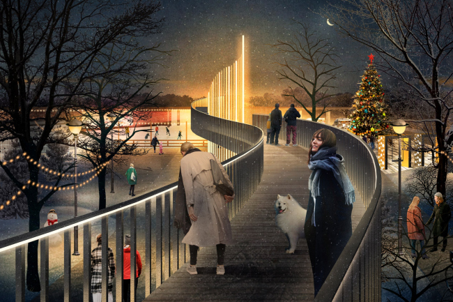 Проект-победитель конкурса Малых городов для Клина: длинный променад с точками притяжения, смотровыми площадками и всесезонно активными пространствами.