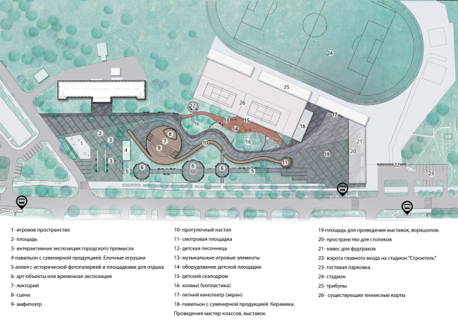 Участок у стадиона «Строитель» представляет собой заброшенное малое футбольное поле и ряд теннисных кортов. На месте этой площадки формируется многофункциональная территория, удовлетворяющая запросы горожан и гостей города. На участке появится площадь для проведения мастер-классов с павильонами ремесленной продукции, зона тихого отдыха с экспозицией истории города и арт-объектами, пешеходный приподнятый настил с лекторием и сценой, смотровая площадки, геопластика с игровыми элементами и многое другое. Основа «жизни» формируемой территории – это всесезонность. Возможность проводить городские праздники и фестивали круглогодично привлечет малый бизнес и увеличит туристическую привлекательность города.