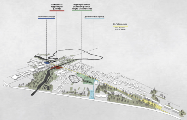 Участок проектирования расположен на отрезке улицы Чайковская от Советской площади до ГАУК МО «Государственный мемориальный музей-заповедник П.И. Чайковского». Улица уже давно не является трактом и неизбежно постепенно меняет свою функцию. Используя удачно сложившееся исторически и географически положение улицы – на пересечении путей, мы предлагаем трансформировать ее в променад – новый образ поведения горожан и гостей города.