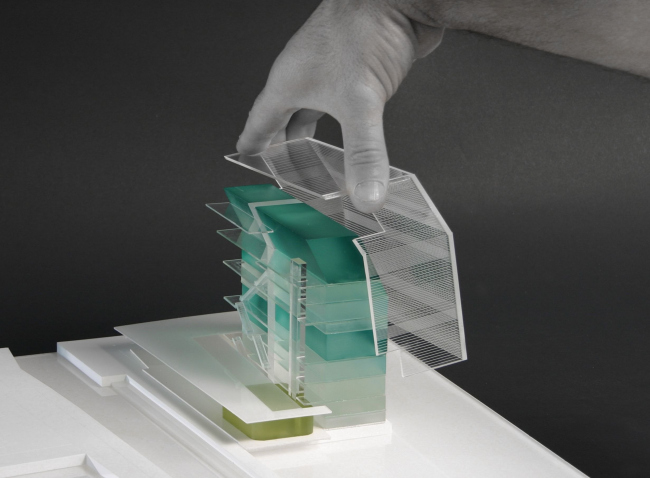 Остекленные части фасада соседствуют с покрытием из «гофрированных» алюминиевых панелей с перфорацией. Благодаря этой проницаемой серебристой оболочке облик музея меняется вместе с погодой и освещением.