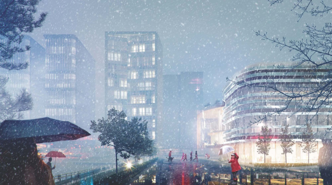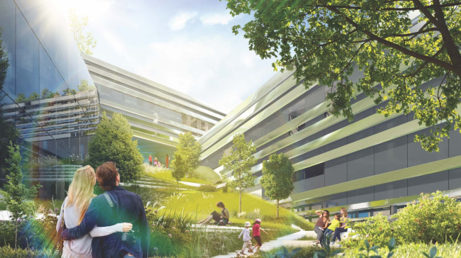 Другая Важная часть проекта – общественное пространство, решенное в виде зеленого холма-амфитеатра.