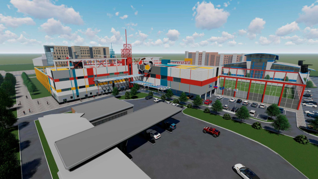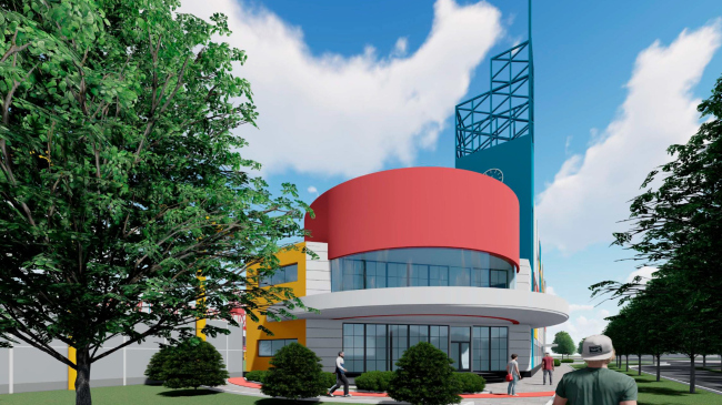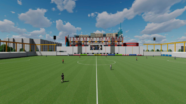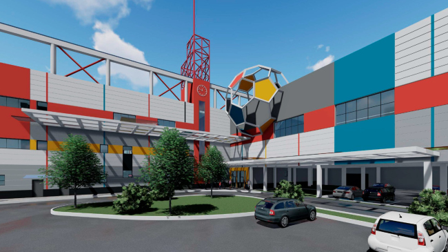 Комплекс для ФК «Коломяги» включает в себя два футбольных поля – большое игровое и тренировочное поменьше, здание Клуба и отдельное здание Центра детского спорта. Фасады планируется облицевать сендвич-панелями FunderMax, простые прямоугольные объемы дополняются «упрощенным супрематическим ордером», «мачтами», перголами, часами и гексогональной конструкцией мяча, помогающего определить функцию здания. Главная роль, конечно же, отводится цвету – мастерская провела масштабное исследование, подбирая палитру на основе работ художников-авангардистов, с помощью цвета обыгрываются даже такие технические элементы, как нащельники между панелями, размер которых соответствует «традиционному петербургскому русту».