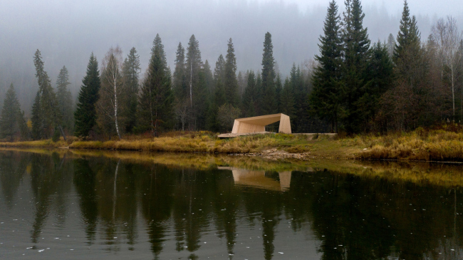 «Альфа» стремиться оказать как можно меньшее воздействие на экосистему и в то же время дополнить природный контекст. Площадка установлена на небольшом возвышении у реки, спускаясь к ней террасой, общий объем напоминает груду валунов или завихрения бурного потока, при этом вся конструкция облицована массивом ели.