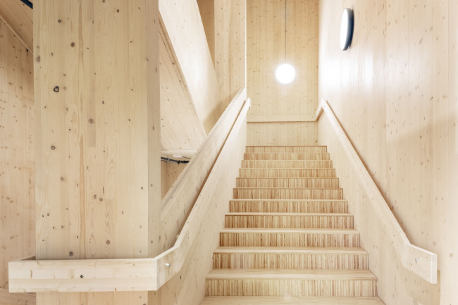 Башня гостиницы выстроена из модулей, изготовленных из перекрестно-клееной древесины (CLT), лестнично-лифтовые узлы тоже полностью сделаны из CLT. Балки и колонны в невысоком культурном центре выполнены из клееной древесины (GLT), циркуляционные узлы и стены жесткости (shear walls) – из CLT. Продуманное конструктивное решение сделало ненужным бетонный каркас, что не только позволило уменьшить выброс углерода, но и ускорило строительство. Перекрытия в обширных фойе центра сделаны гибридными, с использованием стали.