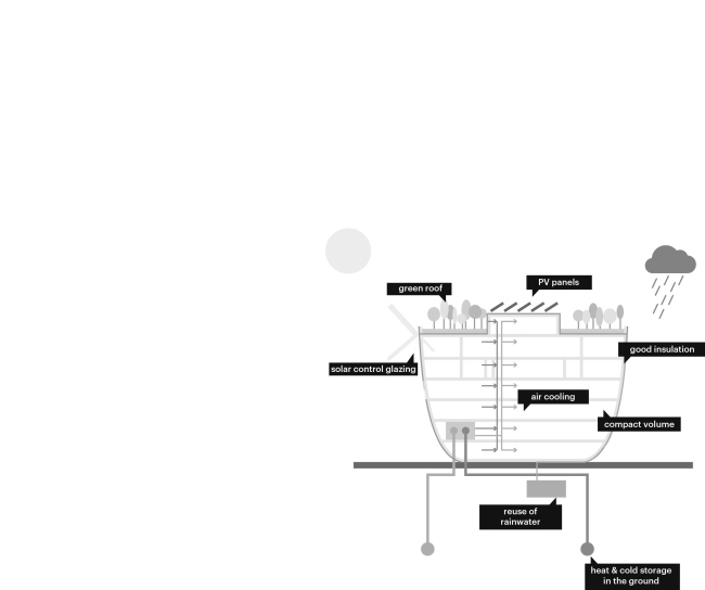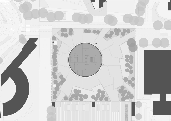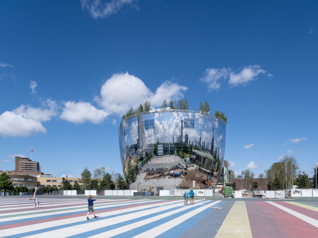 Фондохранилище неспроста напоминает по форме чащу: чтобы вписаться в наземный ландшафт центра Роттердама и его подземное устройство («буферные» резервуары ливневой канализации) пятно застройки должно было быть минимальным. Поэтому в основании здание имеет диаметр 40 м, а на уровне крыши – 60 м. Округлая форма – отказ от заднего, «неглавного» фасада, который в таком важном окружении невозможно никуда обратить. По той же причине – плотная и значимая среда – фасады сделаны зеркальными (1664 стеклянных панелей общей площадью 6609 м2): они постоянно отражают окружение, меняясь вместе с погодой и временем суток, но не имеют своего цвета или выраженной фактуры.