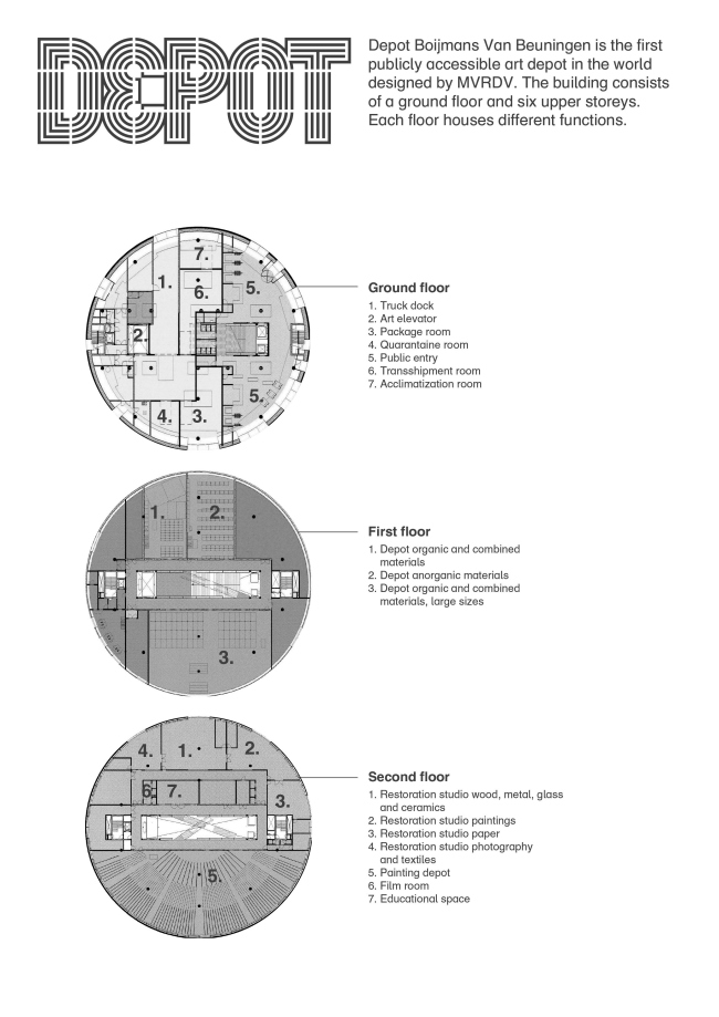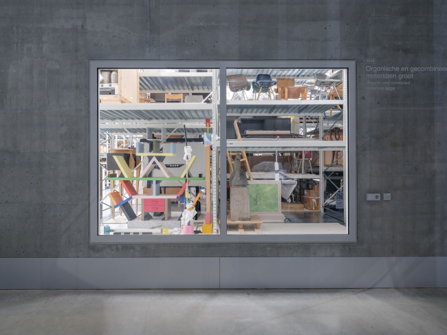 Поэтому проект MVRDV и претендует на статус первого в мире музейного фондохранилища (общая площадь – более 15 тыс. м2), полностью доступного публике. Это касается всех 151 тысяч экспонатов: даже обычно скрытые от вредного воздействия света рисунки, гравюры и фотографии любой посетитель может запросить для показа, а с кино- и видеоматериалами – ознакомиться в специальных «просмотровых». Живопись, скульптура, дизайн, арт-объекты можно изучать самостоятельно или же присоединиться к регулярным экскурсиям (доплачивать за участие в них не нужно). В атриуме с диагонально пересекающимися лестницами предусмотрено несколько витрин для «точечной» экспозиции тех или иных предметов.