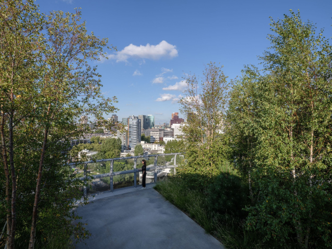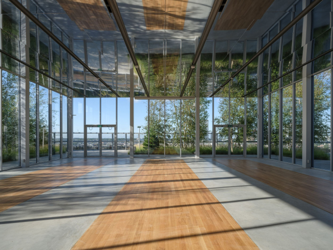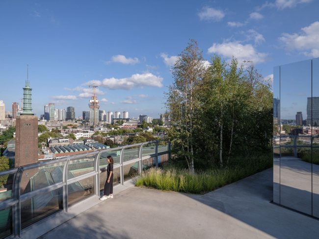 На последнем, седьмом этаже постройки находится его главный после произведений искусства аттракцион: березовая роща (с небольшим вкраплением сосен), откуда можно полюбоваться видами города с высоты почти 40 метров. Там же находится работающий допоздна ресторан (на крышу ведет экспресс-лифт, поэтому от часов работы музея ее пространство не зависит): его павильон можно арендовать для проведения мероприятия. 75 многоствольных берез перед высадкой на кровле три года готовились в питомнике к пересадке, в частности, ради появления разветвленной корневой системы: ветровая нагрузка в саду над музеем гораздо выше, чем на уровне земли. Также в саду растут 20 сосен и различные травы.