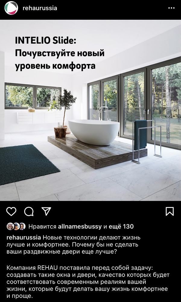 В обновленном Instagram потребитель может не только познакомится с решениями REHAU, но и узнать, как и где лучше их применять. Например, сейчас производитель запустил целую серию постов по параллельно-сдвижным окнам и дверям INTELIO Slide. Это относительно новый продукт, при выборе которого покупателю просто необходима подробная консультация специалиста. Контент, размещенный в Instagram-канале, помогает пользователям разобраться со многими вопросами, возникающими на разных этапах принятия решения о покупке.