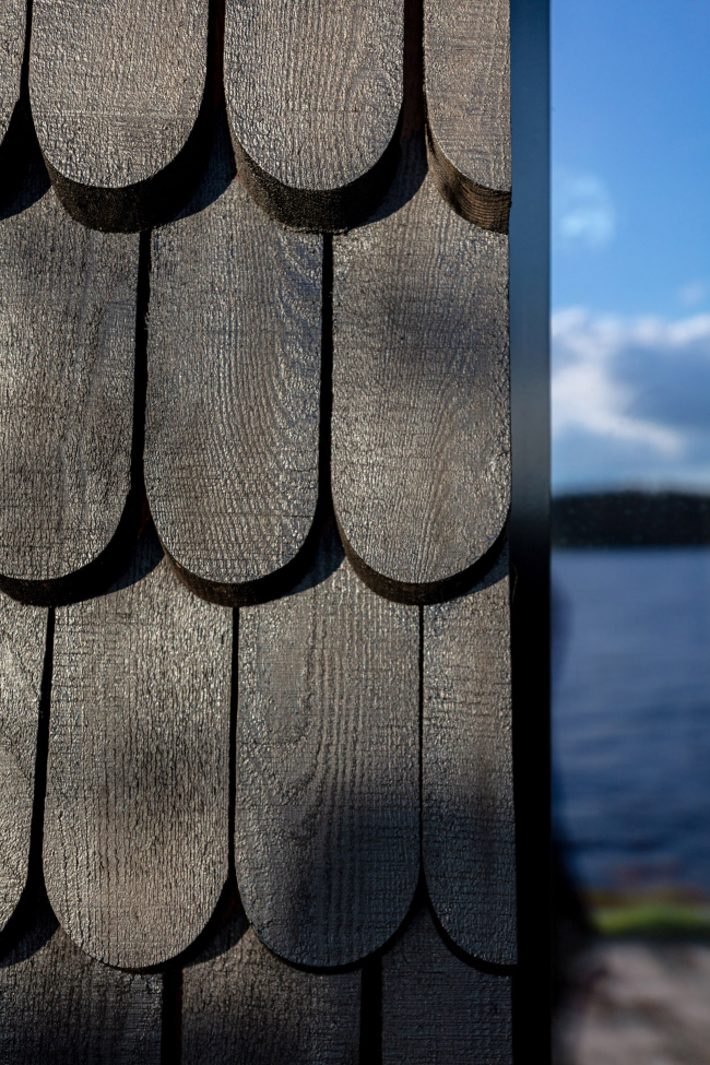 «Хижина режиссера»Фото © Marc Goodwin«Хижина режиссера»Фото © Marc Goodwin«Хижина режиссера»Фото © Marc Goodwin«Хижина режиссера»Фото © Marc Goodwin«Хижина режиссера»Фото © Marc Goodwin«Хижина режиссера»Фото © Marc Goodwin «Интровертивный» функционал постройки прочитывается в ее расположении: ее вход и главное окно обращены к озеру, расположенное всего в нескольких метрах, а с «тыла» глухой фасад прикрывают высокие сосны.