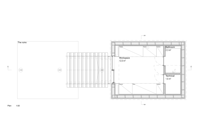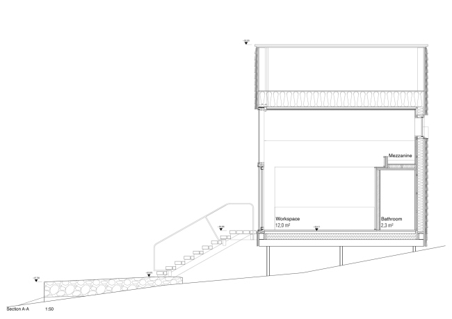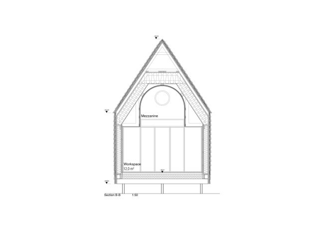 «Хижина режиссера»Фото © Marc Goodwin«Хижина режиссера»Фото © Marc Goodwin«Хижина режиссера»Фото © Marc Goodwin«Хижина режиссера»Фото © Marc Goodwin В ниши, образованные «боковыми нефами», встроена мебель – столешницы, книжные полки, диван и камин. Все рабочие поверхности выполнены из светлой древесины – по мысли специалистов из Pirinen & Salo, это должно помочь заказчику сконцентрироваться на выполнении творческих задач. В «апсиде» расположена антресоль с небольшим круглым окном, предназначенная для отдыха и размышлений. Все технические устройства, необходимые для комфортной жизни, спрятаны в стене под антресолью.«Хижина режиссера»Фото © Marc Goodwin