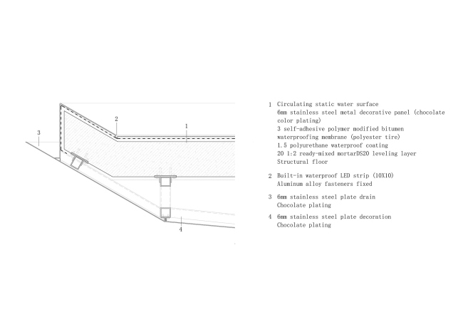 Основой для павильона служит округлая платформа из нержавеющей стали, тонированной в шоколадный цвет, именно этот продукт она и символизирует. Она физически и визуально выделяет постройку из окружения, при этом далеко выступая над рекой. Поверхность платформы покрыта тонким слоем воды.
