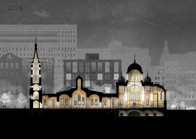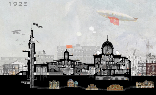На примере собора Богоматери у Калужских ворот в Москве я попыталась представить сценарий, при котором в послереволюционное время храмы не сносили, а реконструировали. В 1 работе мы можем наблюдать собор в период НЭПА. Люди спешат принести пользу Отечеству: в небе проходят испытания новой модели самолета; как корабль плывет дирижабль с изображением вождя; на улице идёт парад в честь главных членов партии, но самые интересные события разворачиваются в храме. Под самым куполом происходит партийное заседание, в главном зале премьера спектакля, в колокольне проводятся опыты авиамоделирования. И лишь глубоко под землей ещё есть духовная жизнь: осталась домовая церковь, в которой все ещё идут богослужения.