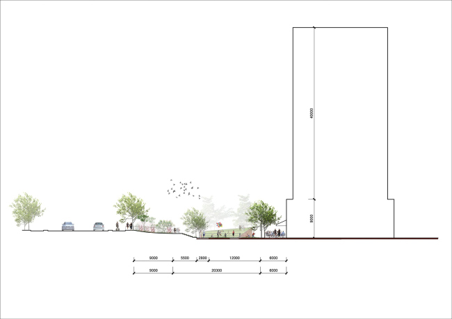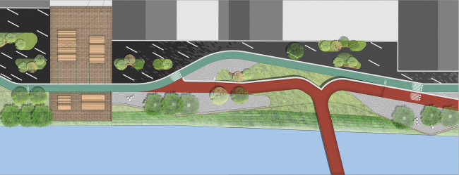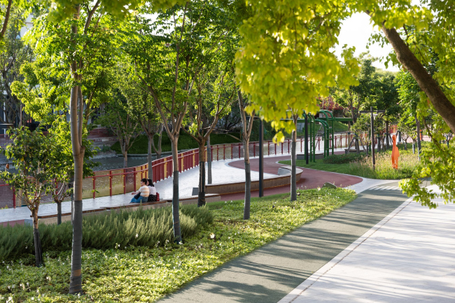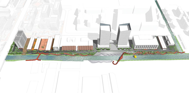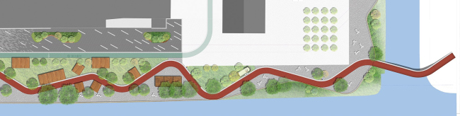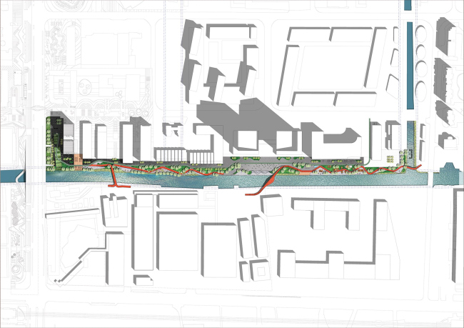 Линейный парк, получившийся у архитекторов SPARK, разделен на четыре функциональные зоны, где есть лужайки, кафе, спортивные площадки и «плаза» для проведения мероприятий.