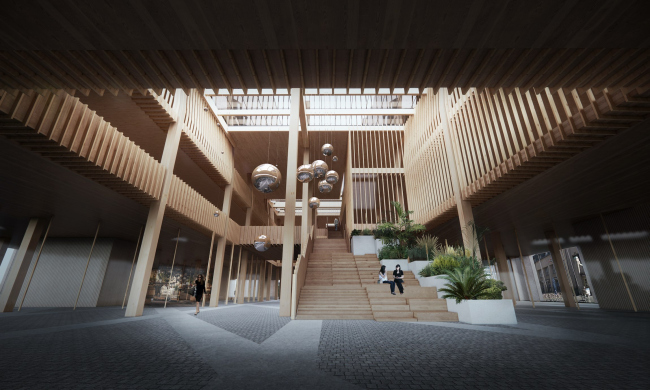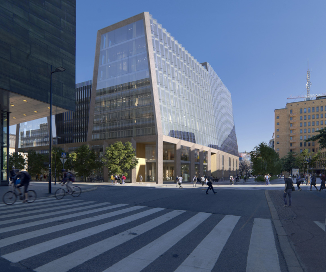 Первая ее часть касается площади Элиэля, расположенной за зданием ресторана «Влтава». Оно было построено примерно одновременно с вокзалом, возможно, также по проекту старшего Сааринена, и является охраняемым памятником. Его отреставрируют и уберут более поздние пристройки, сохранив как сам ресторан, так и уличную открытую зону при нем. А за ним, на месте существующего автобусного терминала, возведут два объема, соединенные более низкими атриумами и крытыми общественными зонами. Высоты уступчатых объемов, скошенные плоскости фасадов и ребристые, сужающиеся завершения продиктованы окружающей застройкой. Конструкции здания планируется выполнить из дерева, а для отделки использовать стекло, финский гранит и сталь, что опять же позволит вести диалог с архитектурой вокзала. Внутри расположатся бутик-отель, SPA, магазины, офисы, коворкинг, арт-пространства, детский центр и другие пространства. На крышах установят солнечные батареи и создадут зеленые зоны, задействованные в сборе и фильтрации дождевой воды. Стеклянные фрагменты фасадов, световые фонари и специальные ребра позволят максимально использовать возможности естественного освещения. Наконец, открытые террасы обеспечат эффектные виды и связь с городом, а проницаемый первый этаж позволит не нарушить удобные для пешеходов маршруты через этот участок.