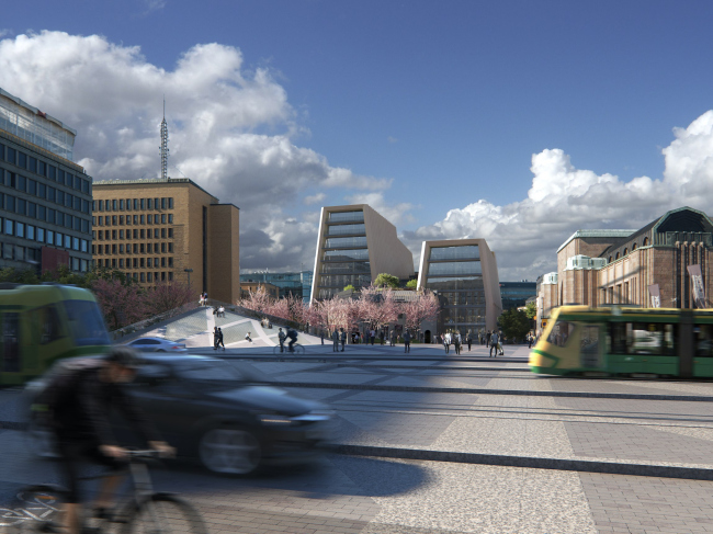 Предложенная архитекторами бюро Snøhetta концепция, разработанная в партнерстве с местными фирмами Davidsson Tarkela Oy и WSP, получила название Klyyga, что можно перевести как «пересечение». Ее цель – оптимизировать сложный фрагмент городской ткани, сократить до минимума присутствие автотранспорта и создать удобный и зеленый пешеходно-велосипедный хаб с развитой подземной инфраструктурой, полностью соответствующий принципам устойчивого развития.