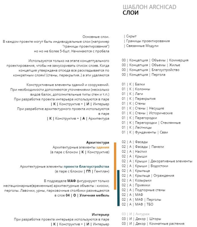 В нашем бюро разработаны несколько шаблонов – шаблон для Благоустройства, Интерьера, Архитектуры. В данный момент ведется работа по дополнительной настройке шаблонов. Так как у нас небольшое бюро, и нет должности BIM-менеджера в чистом виде, этим занимается один из управляющих партнеров – конкретно я. В шаблоне удалены все лишние элементы (большинство родных покрытий, например) преднастроенная 2D- и 3D-графика, основные строительные материалы и покрытия, слои, настройка шрифтов, макетов. Так же есть отдельный файл manual по наименованию слоев, где есть расширенная версия слоев и описания по правилам их компоновки и наименованию.