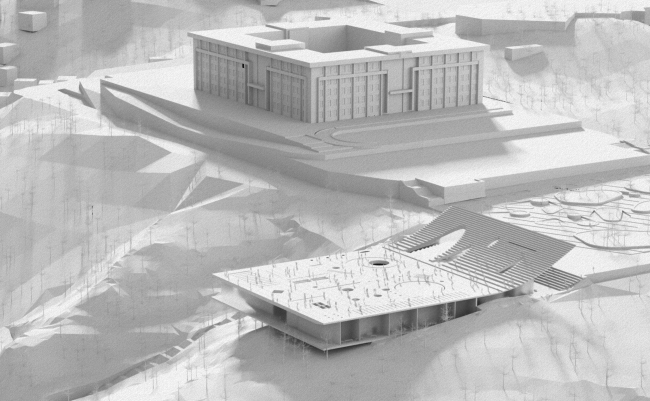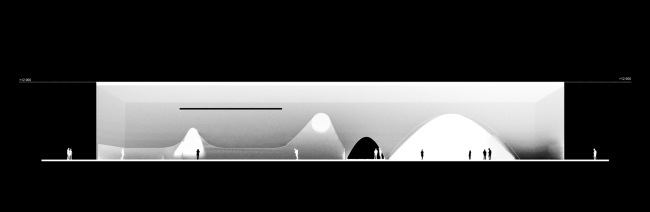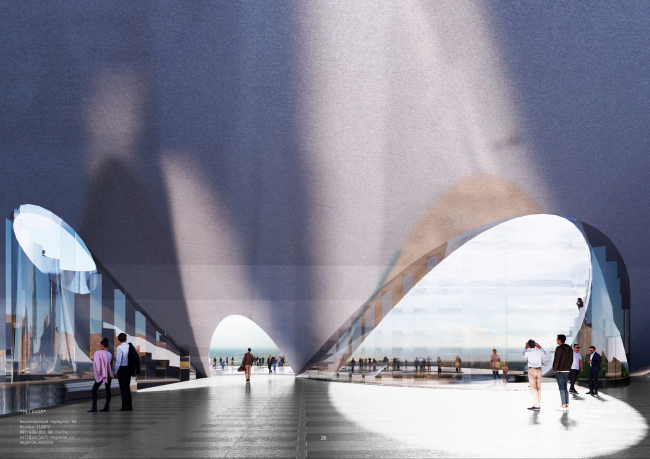 Слева под козырьком вместо ровной «нулевой» поверхности, появляются ступени еще одного амфитеатра, отчасти прикрытого изогнутой поверхностью «козырька» и освещенного через другие прорези, которые здесь играют роль уже не входов, а световых колодцев. Одна из прорезей круглая, другая – тонкая параллельная краю линия; они вторят «супрематическому» рисунку кровли-площади. Всё вместе – авторы, как кажется, намеренно подчеркивают это своей проектной графикой – должно сливаться в некую асимметричную светоносную «триумфальную арку», созвучную, опять же, идее перехода-телепорта, не лишенного фантастичности.