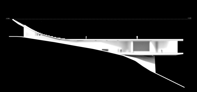 В профиль получается плавная дуга, которая по касательной стыкуется с началом склона и сопрягается с поверхностью эксплуатируемой кровли музея – чей уровень, что важно, равен «нулевому» уровню ближайших городских мостовых и сквера имени Нуриева.