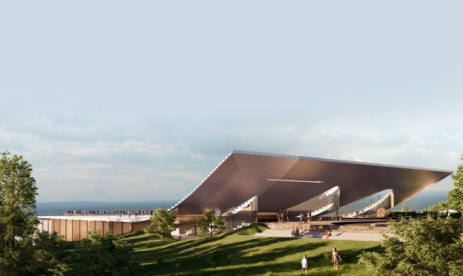 Среди достоинств проекта заказчик отмечает трибуны на крыше, просторную смотровую площадку и минималистичность. Действительно, проект Меганома лаконичен и решен на одном приеме – здание как на вытянутой ладони держит над склоном городскую площадь. И в то же время решение входной части, которая уподоблена изнанке некоей материи, приподнятой ветром над рекой – материи, наделенной ролью то ли стены, то ли козырька, то ли группы переходов иные миры, один из которых музей, другой площадь, третий, надо думать, просто свет – завораживает неожиданно тонкой сценографией.