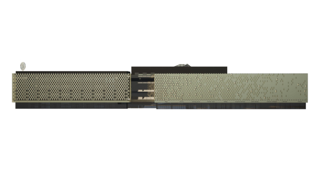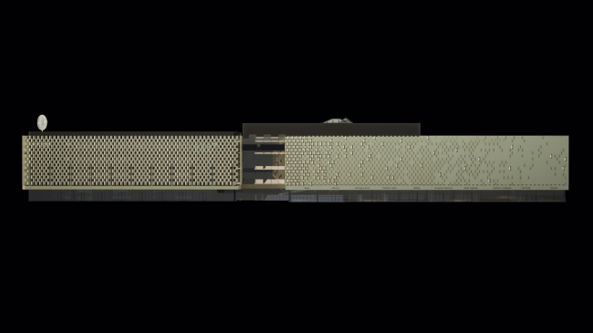 Но главным элементом нового здания станут тоже пластины фасада. Они как бы перепрыгивают на расположенный ближе всего к существующему зданию угол, а по мере удаления их становится все меньше и меньше. Сами новые пластины разделяются на три типа: собственно объемные копии оригинальных модулей, выполненные также из анодированного алюминия или из композитного материала с соответствующим покрытием (около 5% от всех элементов), их уплощенный вариант, но с повторенным характерным рисунком (25 %), и совсем плоские гладкие элементы такого же размера (70 %). Создаваемый разными пластинами и оконными проемами паттерн вторит оригинальному. Пластически активный модернистский фасад таким образом буквально сходит на нет (большая протяженность новой части тоже играет в этом важную роль), уступая место максимально минималистичному и нейтральному решению – следу или даже воспоминанию о былой брутальности.