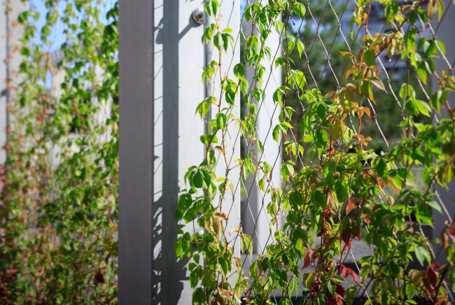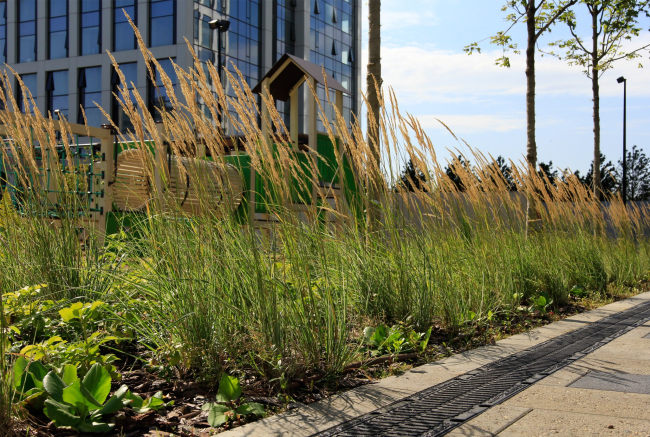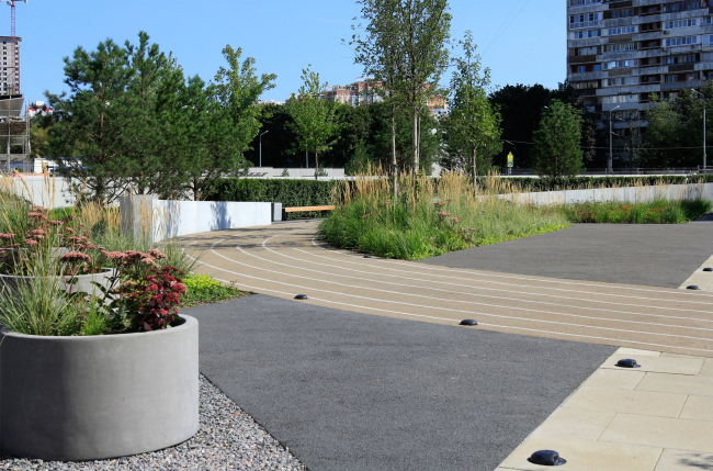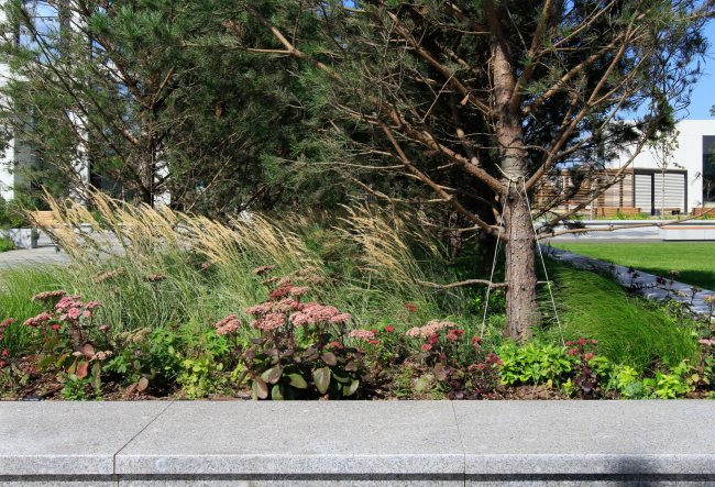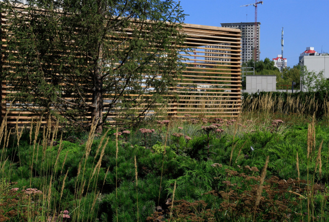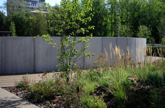Авторы проекта ландшафта сделали акцент на актуальных в наше время злаковых травах – злаков много и они соседствуют как со взрослыми соснами, так и с яблонями и с диким виноградом, который увивает перголы. Таким образом мы видим практически полный набор элементов российской «дачной» культуры: яблони, сосны, девичий виноград; в этот список можно даже включить частых гостей «альпийских горок», невысокие кустарники и молочаи, – только здесь элементы существуют не раздельно: сосны в лесу, травы в полях, яблони в саду, виноград на беседке, – а перемешаны в пространстве двора.