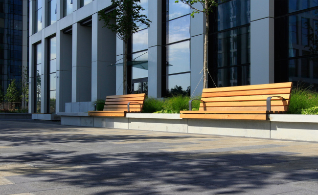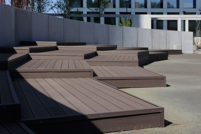 В восточном углу двора, который обращен к городу, но огражден от него, хотя и освещен достаточно хорошо, за оградой бетонной стенки расположился полукруглый амфитеатр с пластиковыми скамьями, имитирующими дерево. Еще несколько ступеней-сидений, уже с деревянным покрытием, вытянуты вдоль спортивных полей как трибуны; скамейки также встроены в бетонные ограждения, приподнимающие зелень, не везде, но местами, над уровнем мостовой.