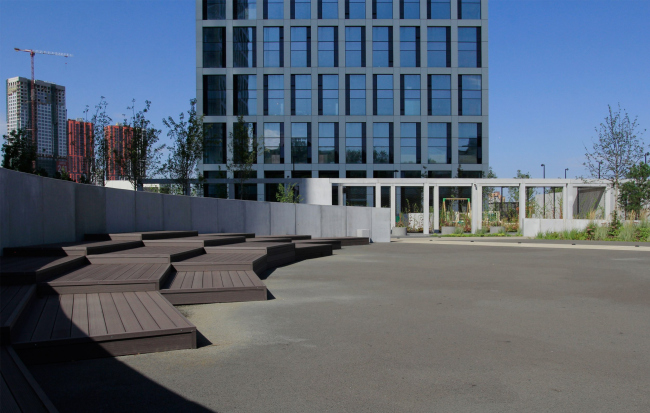 Благоустройство двора ЖК «Небо»Фотография: Архи.руБлагоустройство двора ЖК «Небо»Фотография: Архи.руБлагоустройство двора ЖК «Небо»Фотография: Архи.руЖК «Небо»Фотография © Алексей Народицкий / предоставлено ТПО «Резерв»Благоустройство двора ЖК «Небо»Фотография: Архи.руБлагоустройство двора ЖК «Небо»Фотография: Архи.руБлагоустройство двора ЖК «Небо»Фотография: Архи.ру Зонирование не только с помощью пергол, растений и геопластики, но и радикальное – бетонными стенками, надо признать смелым решением. Подобные варианты бетонных выгородок встречаются нечасто: стенки чаще используют в качестве подпорных, как часть решения пространства с перепадом высот, а здесь – на ровном месте. Плюс такого решения заключается в том, что оно позволяет разделить пространство очень явным образом, «разрезать» его, усилить смену впечатлений при переходе из одной зоны к другой. Кроме того, если бетонные перголы выглядят как парафраз фасада, то стенки перекликаются с внешней стеной, окружающей по контуру весь двор. Парафразом стенок, в свою очередь, выглядят круглые бетонные кадки для цветов.