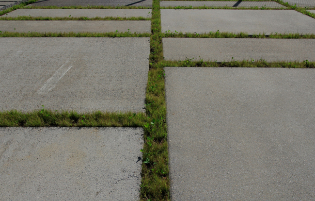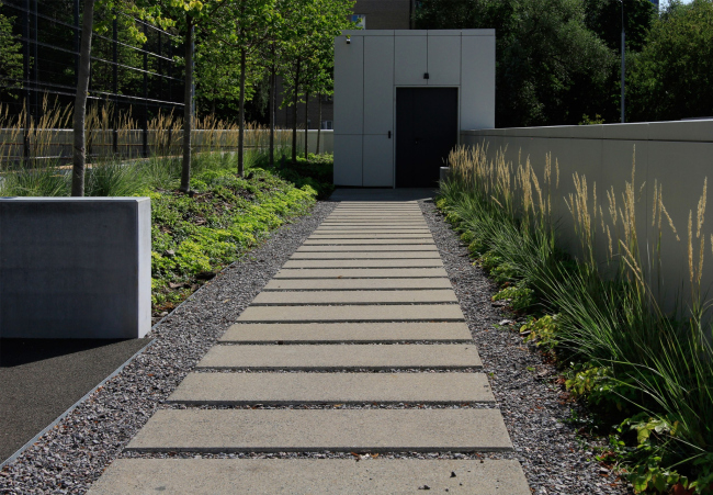 «Дачное» впечатление усиливают бетонные плиты, уложенные здесь на значительном расстоянии друг от друга: где-то это расстояние заполнено каменной крошкой, а где-то травой – как будто мы гуляем или идем за грибами по старому шоссе, и швы заросли естественным образом. Этот элемент не то чтобы сразу бросается в глаза, но между тем кажется практически ключевым для понимания проекта.