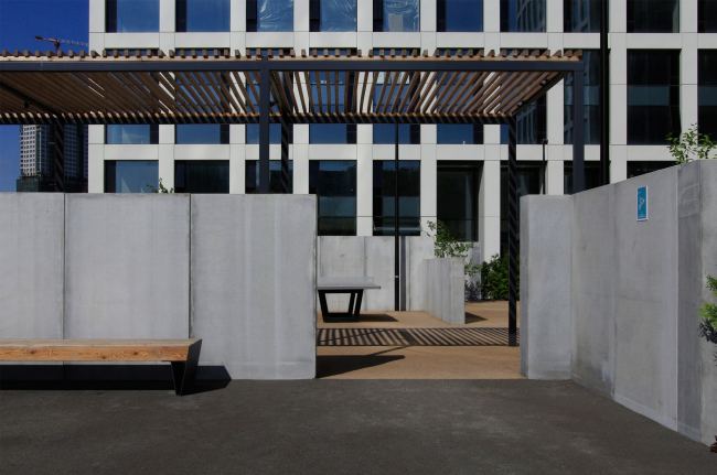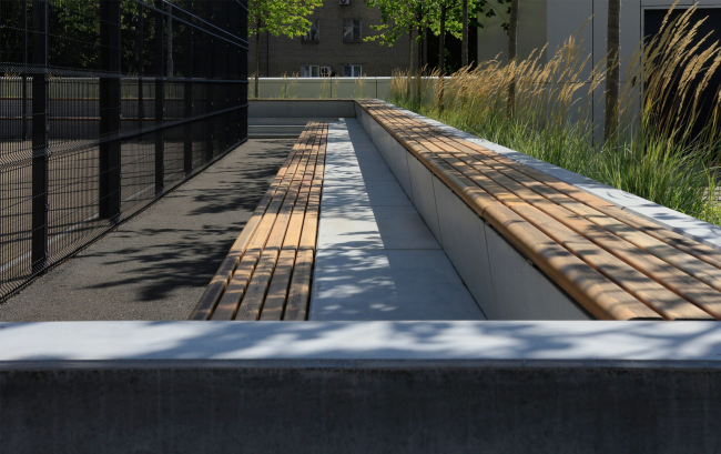 Поскольку ландшафт двора построен, как кажется, на равномерном балансе между достаточно пышной, но местной, неяркой, растительности, и регулярного мощения, элементов, решенных достаточно строго, если не сказать брутально. Деревянные решетчатые перголы соседствуют с бетонными стенками, зонирующими двор, и бетонными же перголами, которые выглядят прямой проекций решения фасадов ЖК «Небо» в контекст его двора, некоей трехмерной материализацией фасадной сетки.