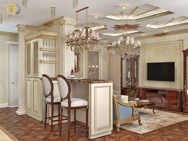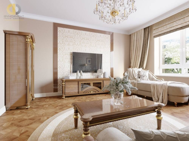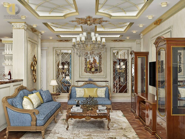 В таком помещении всегда должен быть центр и зона для отдыха. Дизайн классического интерьера всегда создает ощущение завершенности, гармоничности, респектабельности и безупречности вкуса владельцев дома.