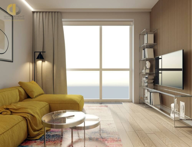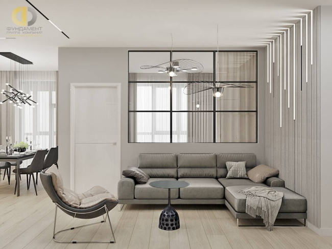 Минимализм функционален, поэтому дизайн подразумевает зонирование пространства. Декора в гостиной будет немного. Для отделки стен, пола и потолка используются сдержанные цвета светлых оттенков: