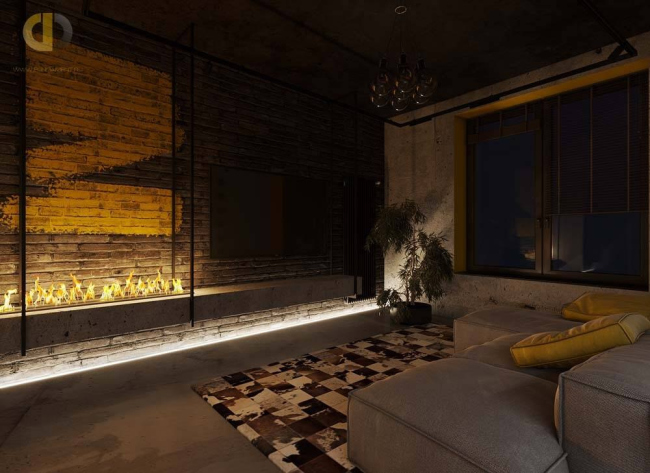 Обязательными элементами гостиной в стиле лофт являются телевизор и диван. Тепло в такое помещение поможет добавить камин, расположенный в центре гостиной или в зоне отдыха.