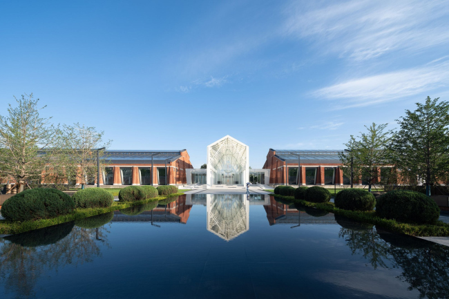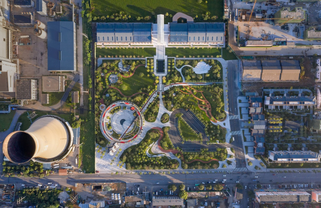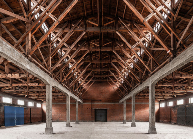 Расположенные в центральной части участка исторические здания №2 и №4 представляют собой привычные ангары красного кирпича с двускатной крышей с характерным изломом. Длина каждого составляет 90 м, а ширина – 30 м, при этом поставлены они торцами друг к другу. Территорию перед и за ними расчистили и разбили два парка. В результате композиция немного напоминает дворцово-парковые ансамбли, так как имеет ярко выраженную ось. Ее задает узкий остекленный объем зала регистрации браков, встроенный между историческими корпусами. Торжественно белый и легкий, он контрастирует с массивными ангарами, но одновременно в нем повторяется эффектный рисунок их исторических деревянных конструкций.