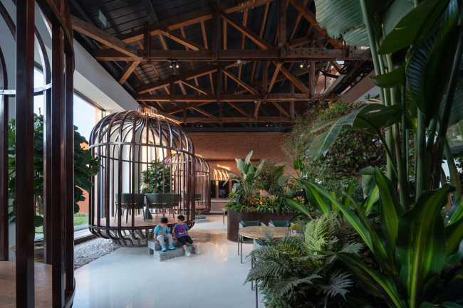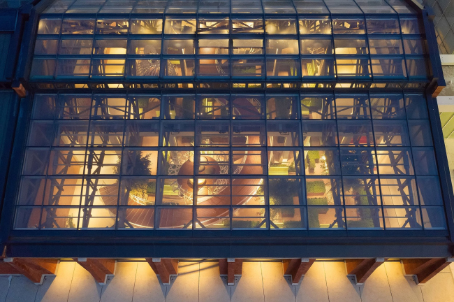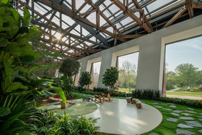 Эти балки, спроектированные в свое время советскими специалистами, и пробивающийся сквозь них свет из верхних окон произвели на главного архитектора проекта Вана Хуэя сильное впечатление. А вот сохранить их оказалось совсем не просто, так как нормам для общественных зон такое решение уже не соответствовало. В результате в конструкции через определенные промежутки были внедрены стальные элементы, повторяющие рисунок деревянных балок. Они и приняли на себя всю нагрузку. Дополнительно были усилены внутренние бетонные конструкции и расширены боковые оконные проемы.