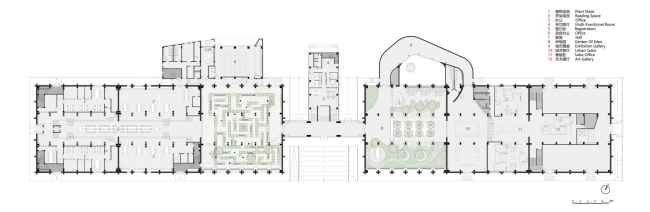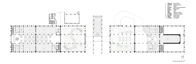 Левый ангар № 2 трансформировался в районную библиотеку, причем архитекторы постарались создать яркие и захватывающие сценарии, чтобы привлечь сюда и взрослых, и детей. В правом ангаре №4 разместили офис продаж и выставочные пространства. Внутренняя планировка обоих корпусов следует исторической трехчастной структуре бывших складов. При этом ближайшие к центральной оси модули отданы под зеленые зоны: библиотеку открывает захватывающий многоуровневый «лабиринт», а в выставочный корпус можно попасть пройдя через «райский сад». Для их устройства пришлось часть железного покрытия с южной стороны скатов кровли заменить на стеклянные панели.