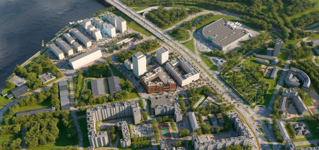 Участок планировочно разделен на две части: южную с замкнутыми домами-кварталами и северную с проницаемой застройкой и общественными пространствами у реки. Между участками пролегает улица Госпаровская, которую дополнят велосипедные и пешеходные маршруты, также в «пограничной» зоне располагаются два архитектурных памятника: электростанция купца Ивана Игнатова и деревянное здание торгового дома Плотниковых.