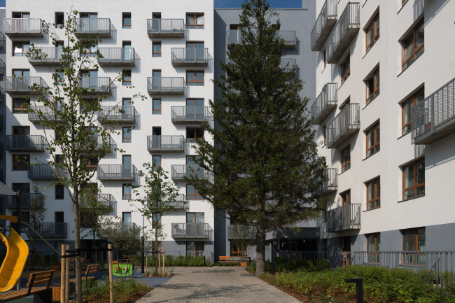 Река – главный элемент, влияющий на организацию пространства. Архитекторы располагают дома линиями, не замыкая их в п-образные кварталы. В совокупности с террасированием это позволяет раскрыть виды на воду как из квартир, так и из города, а отсутствие преград делает территорию проницаемой и дружелюбной. Пространства между домами играют роль линейных парков, но некоторые из них заведомо более тихие – там располагаются только зелень и входы в подъезды, другие наоборот предполагают активность и вмещают детские и спортивные площадки и разнообразный ритейл. Коммерческие помещения занимают в разных зданиях от одного до трех этажей, благодаря чему жители кварталов могут открыть офис, магазин или кафе в своем доме, а также получить необходимые услуги, не выезжая в центр города.