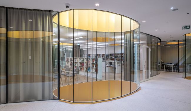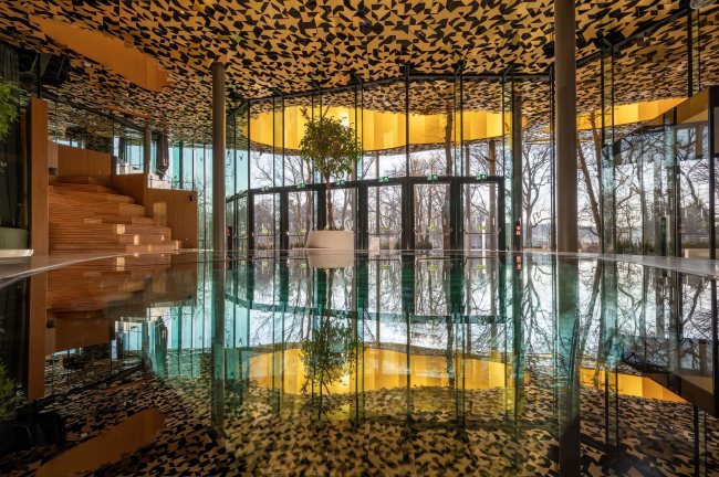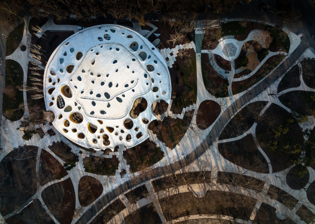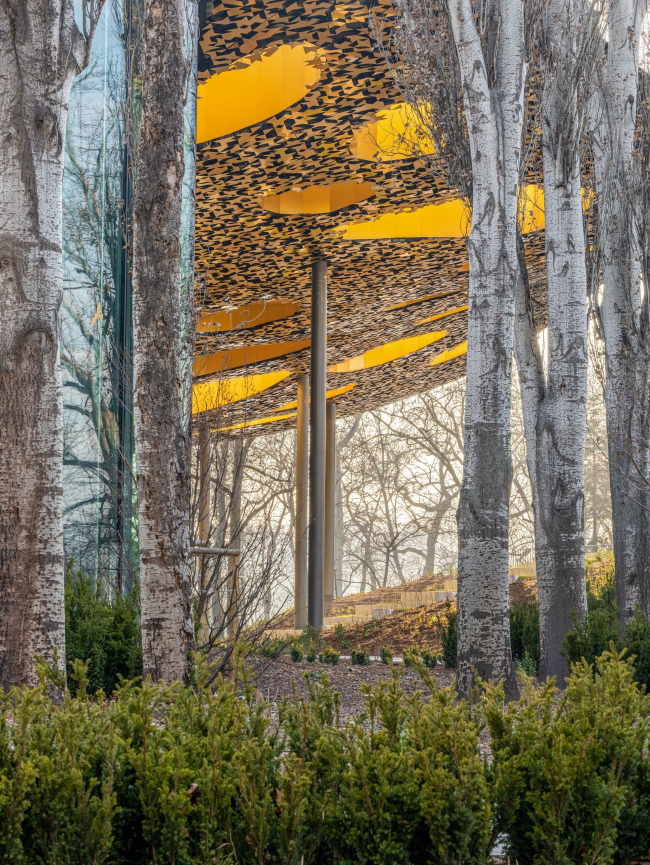 Облик здания по проекту Со Фудзимото строится сверху вниз: главное в нем – крыша. Ее криволинейный профиль повторяет изгибы звуковых волн, почти сотня проемов пропускает внутрь солнечный свет и позволяет прорастать сквозь нее деревьям, а еще ее нижняя поверхность покрыта более 30 000 желтых «листьев», то есть золотая осень окрестностям Дома музыки гарантирована круглый год.