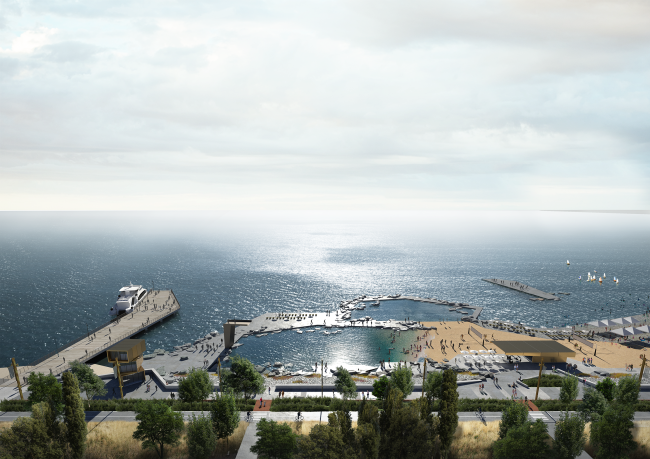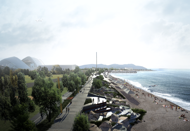 Приоритетом победившей концепции стало объединение городской и природной среды конкурсного участка. Бюро LandLAB предложило увеличить площадь озеленения набережной более чем в 1,5 раза и наполнить территорию новыми общественными пространствами – концертными площадками, лекториями, павильонами для мероприятий и т.д. Ранее разрозненные зоны вдоль набережной (порт, Олимпийский парк, жилые кварталы и пр.) в этом проекте обретают единство. С морем устанавливается постоянный контакт, пляж расширяется, появляется два плавучих бассейна.