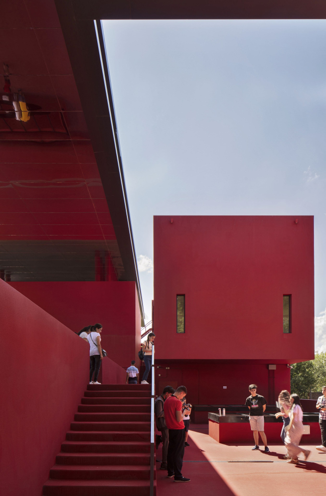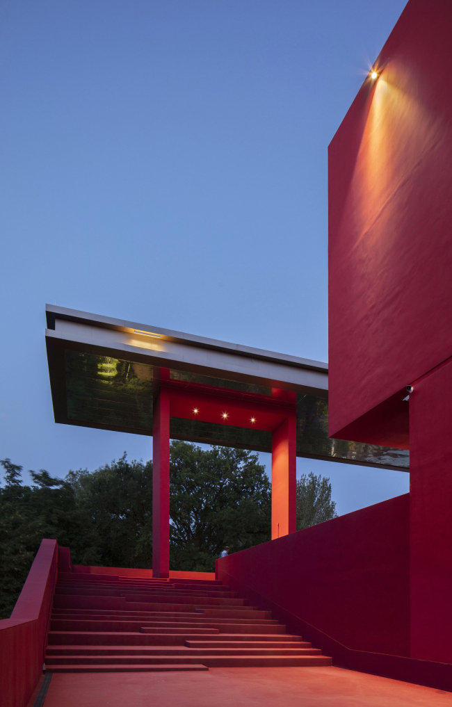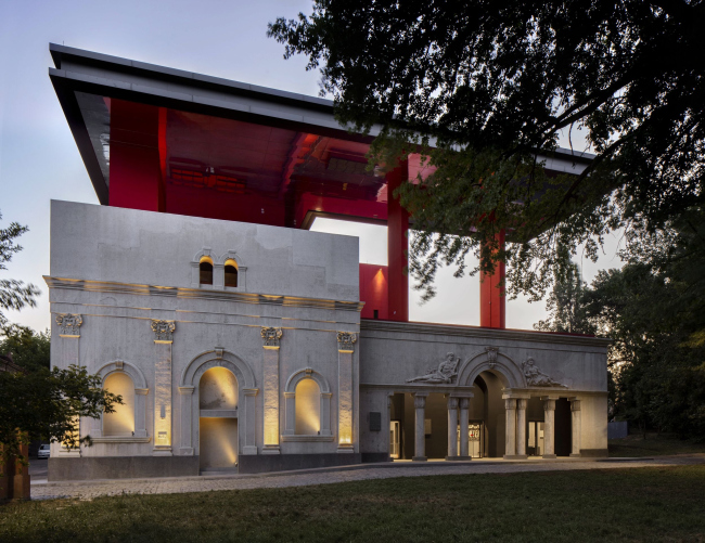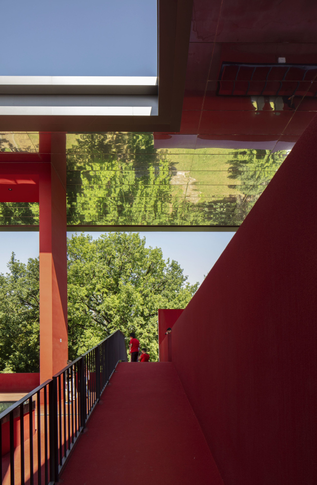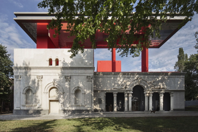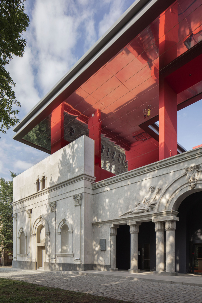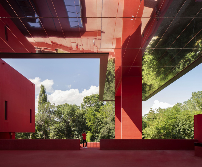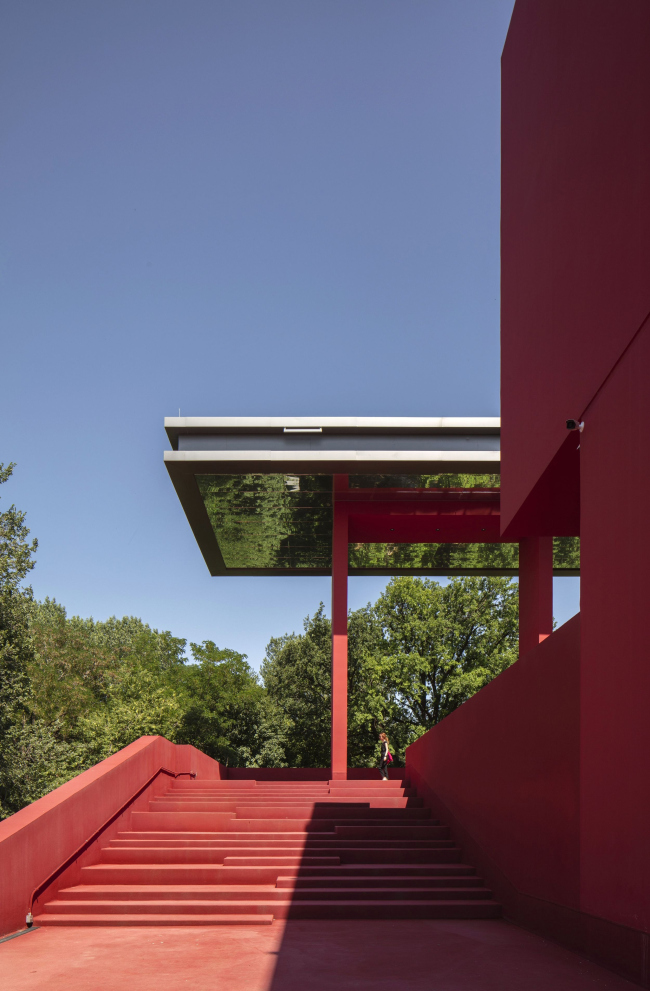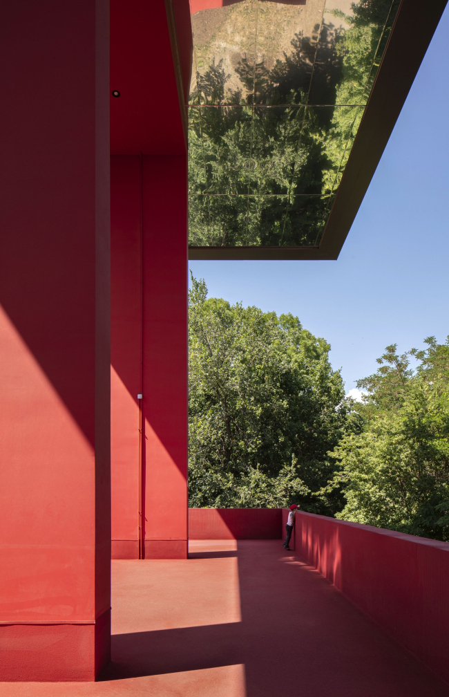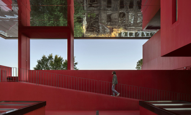 С заднего фасада помещена пологая асимметричная лестница, ведущая на многоуровневую кровлю. Динамика углов и плоскостей превращает крышу в полноценное, яркое общественное пространство. Динамичный эффект усиливается устроенным над ней Г-образным в плане навесом, опирающимся на две рамы. Его плоскость выступает в качестве главного акцента и композиционного стержня нового объема. С внутренней стороны он облицован зеркальными металлическими листами, что усиливает воздействие окружения на облик здания и визуально расширяет пространство под крышей.