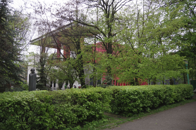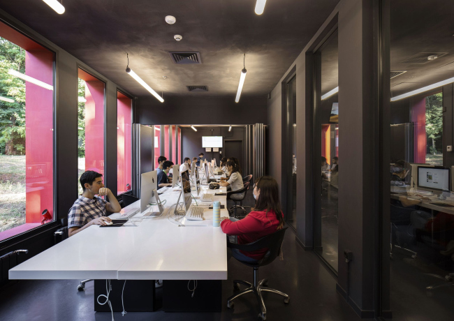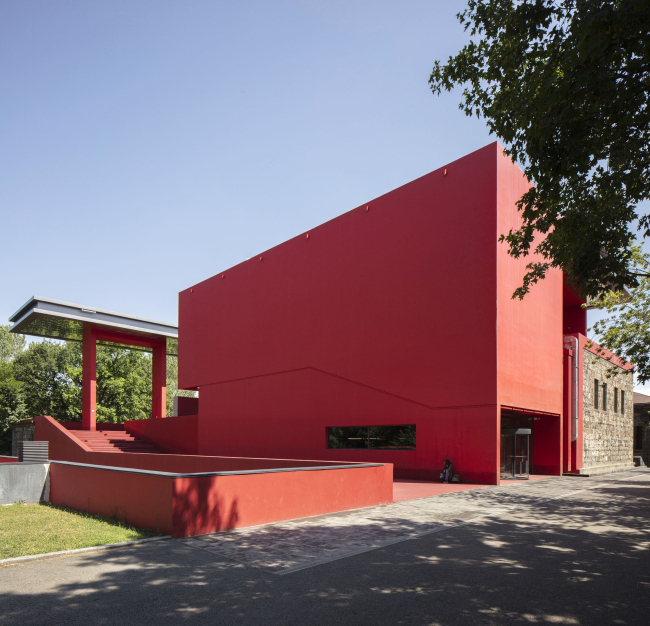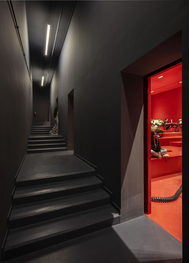 Второй вход организован с заднего фасада – в новом прямоугольном объеме вровень с перекрытиями первого этажа. На втором этаже разместились помещения администрации и кабинеты преподавателей. Этот вход ведет и на третий этаж – в кинозал, контур которого тонко выделен в новом объеме.