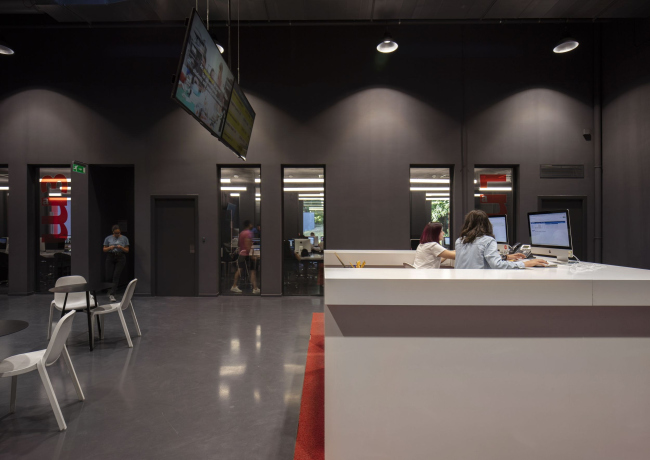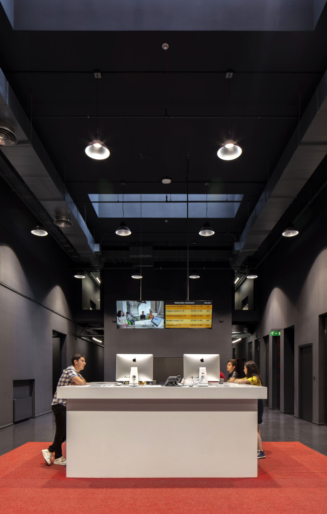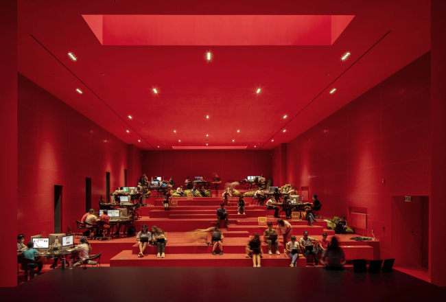 Здание расположено на перепаде рельефа и потому доступно с двух уровней. Главный вход находится со стороны исторического фасада: здесь, на первом этаже расположены основные помещения центра – вестибюль, лаборатории, классы для воркшопов, платформы для самообразования, залы для представлений и концертов, кафе, а также аудитория-амфитеатр, которая удачно вписана в старый зрительный зал.